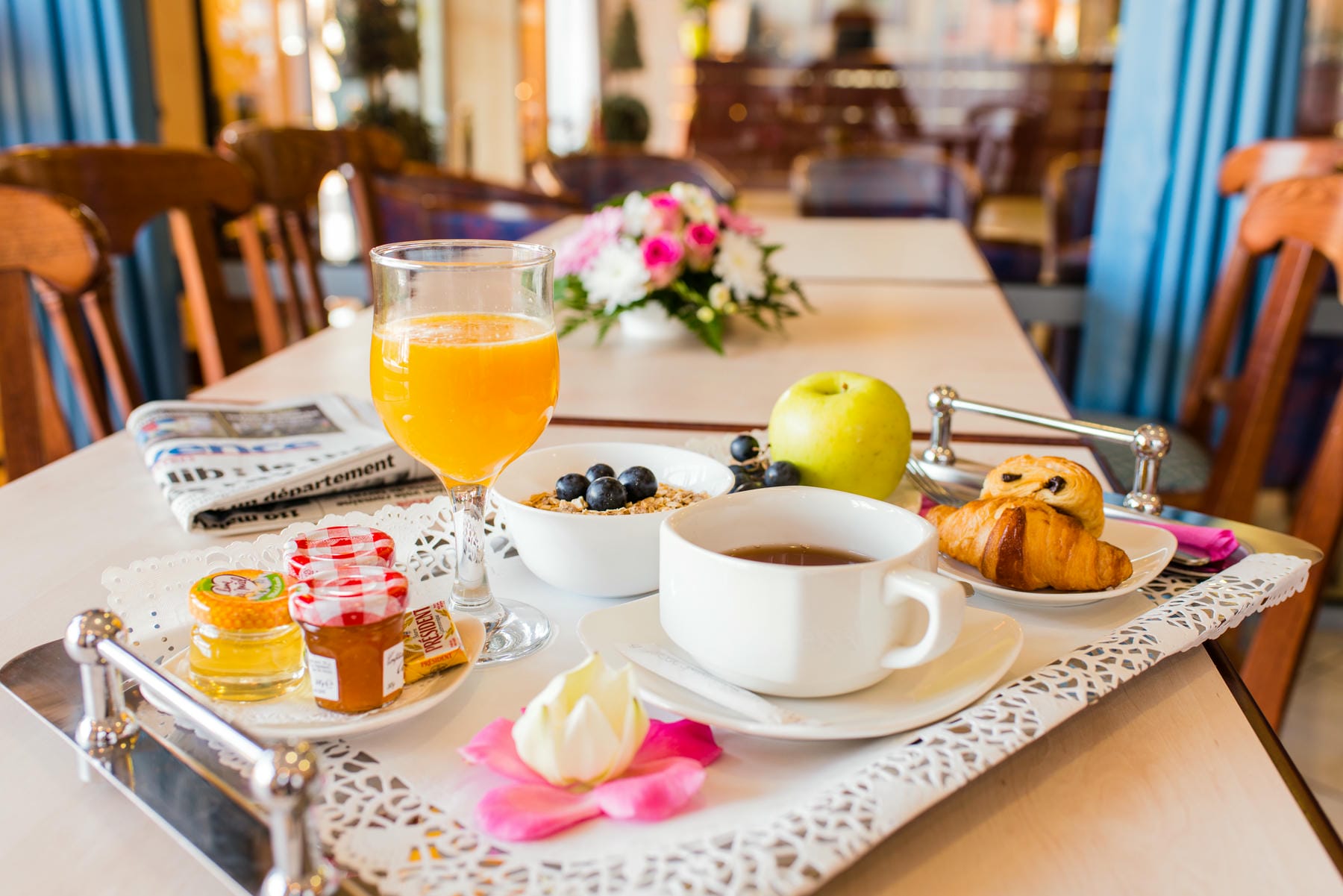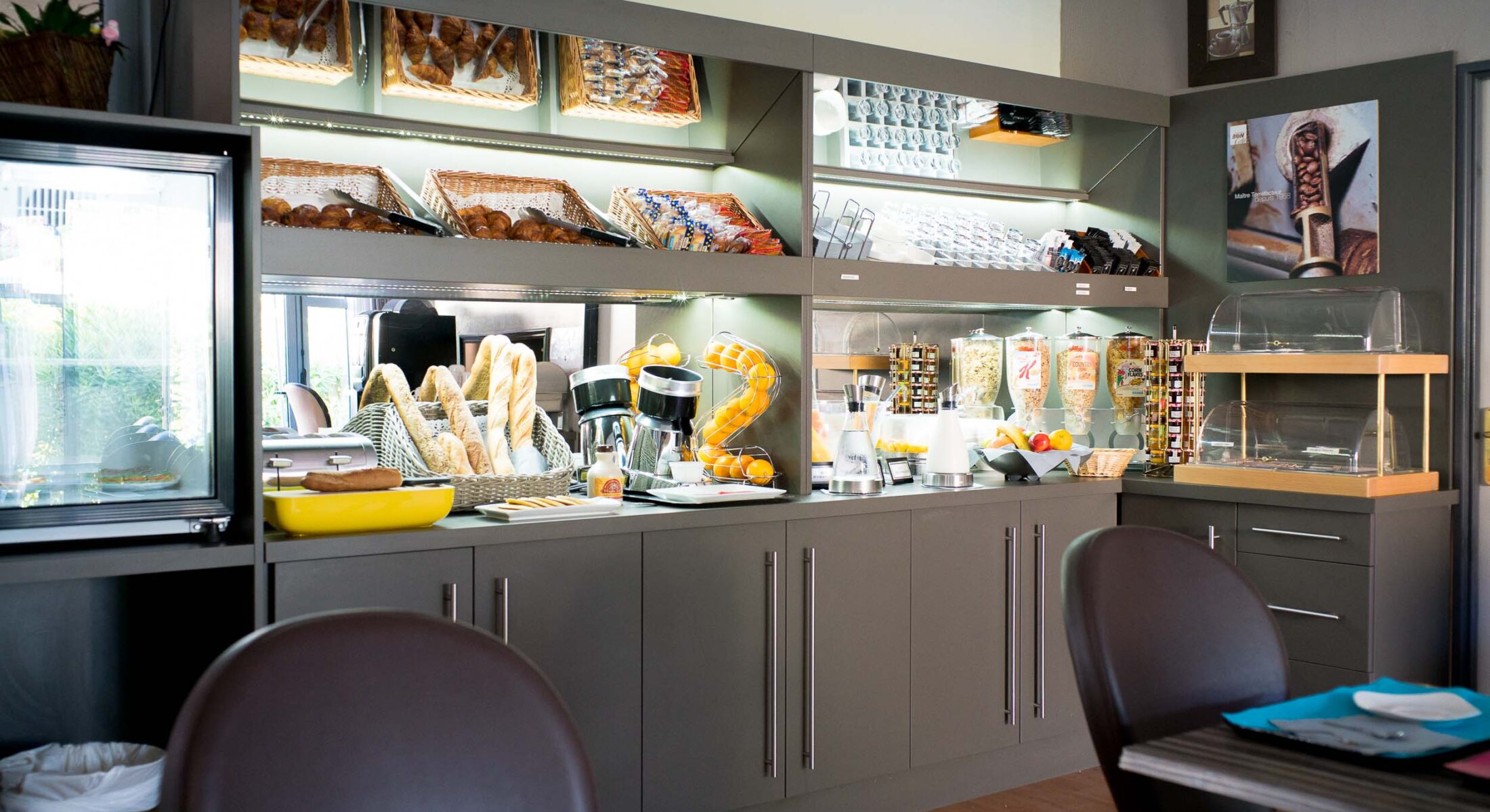 Breakfast is served as a gourmet sweet and savory buffet.